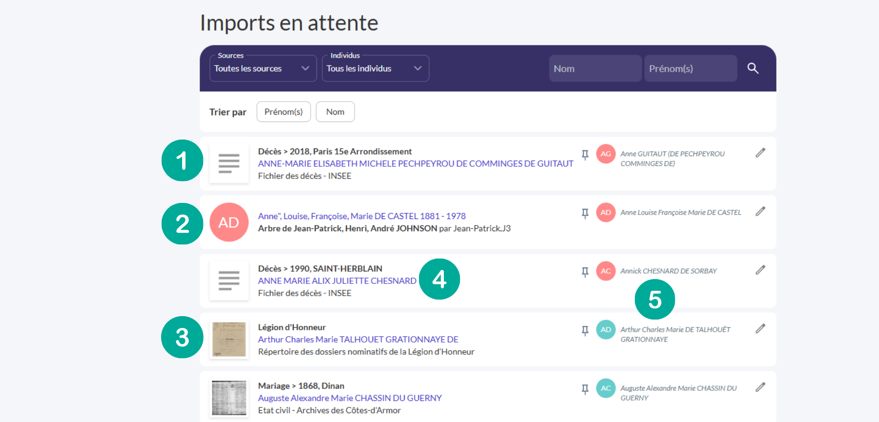 Les imports que vous effectuez vers votre généalogie (depuis des archives, des relevés ou d’autres arbres) peuvent être mis de côté pour être traités ultérieurement. Bonne nouvelle : la page de gestion de ces imports a été entièrement repensée !