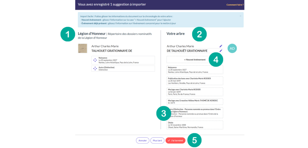 - La cible : La personne de votre arbre à laquelle ces données sont destinées est clairement indiquée (5).