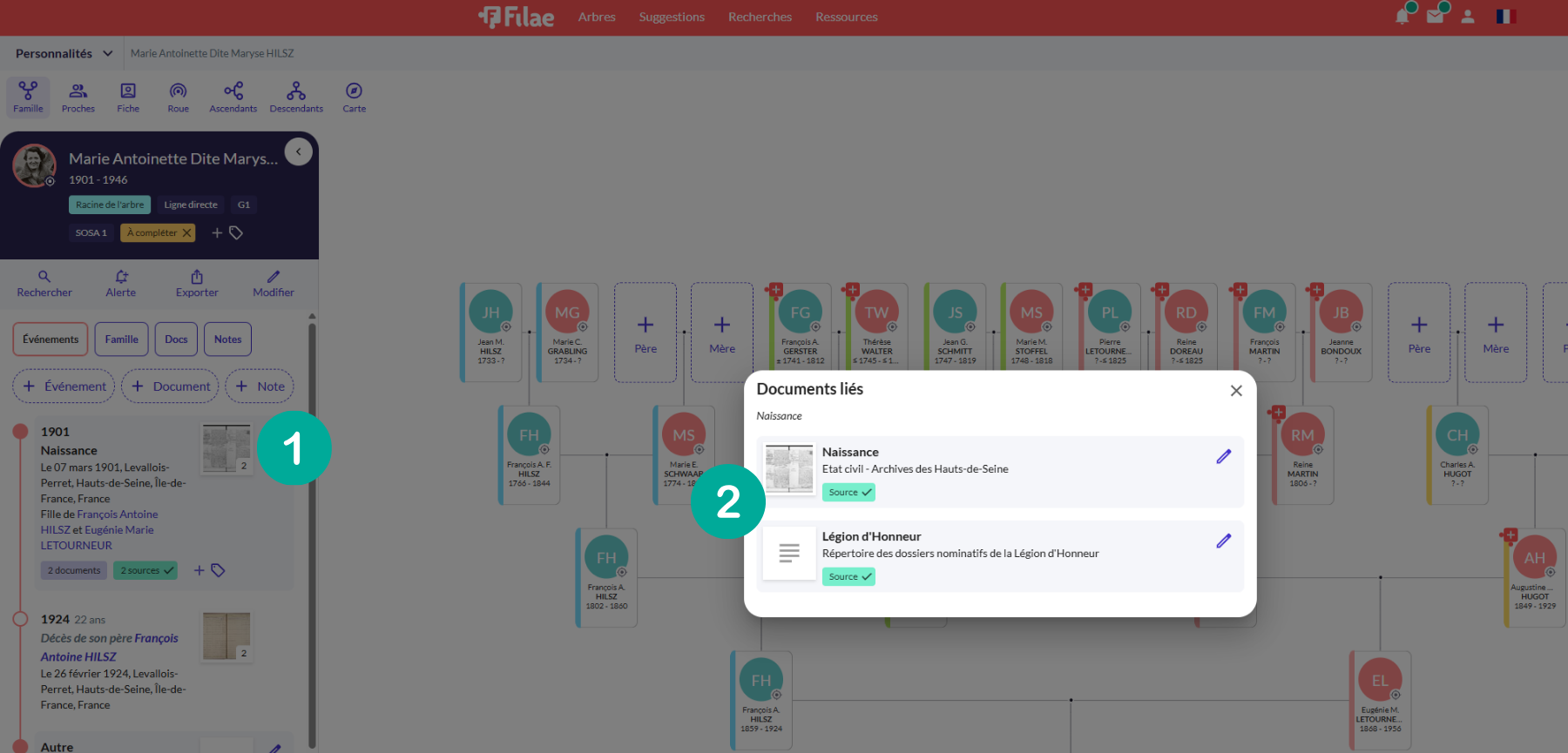 - Le contenu : Retrouvez le type d’événement, la date, le lieu, ainsi que l’identité de la personne concernée (4). Pour les arbres, l’auteur est également indiqué.