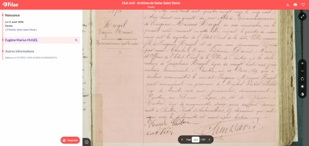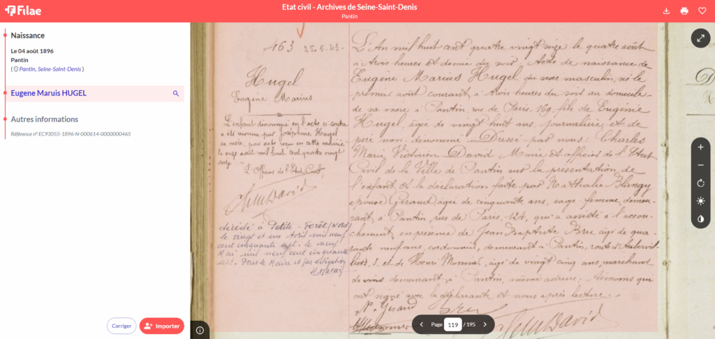 En cherchant d’autres actes à Pantin au nom d’Hugel, nous découvrons la naissance d’Eugène Hugel en 1889. La mère est Eugènie Hugel âgée de 18 ans.
