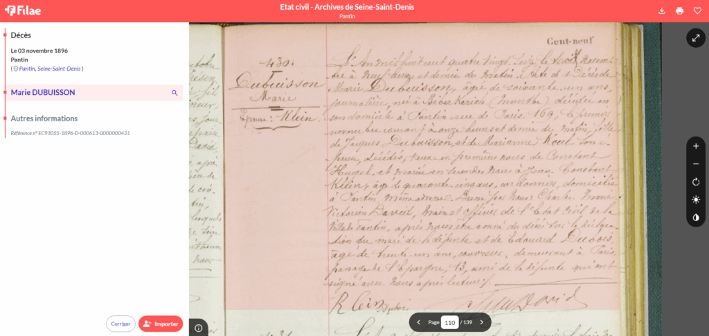 Marie Dubuisson meurt le 1er novembre 1896 à Pantin. L’acte du 3 novembre 1896 nous apprend qu’elle est décédée à son domicile, 169 rue de Paris ! C’est à cette adresse qu’est né Eugène Marius Hugel 3 mois avant.