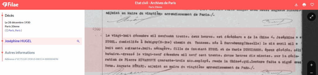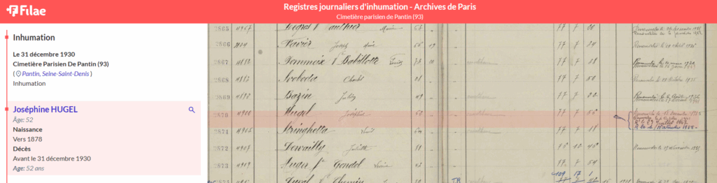 Quelques recherches supplémentaires permettent de retrouver le décès de Joséphine Hugel à Paris en 1930 et son inhumation au cimetière de Pantin tout celui de sa sœur Eugénie.