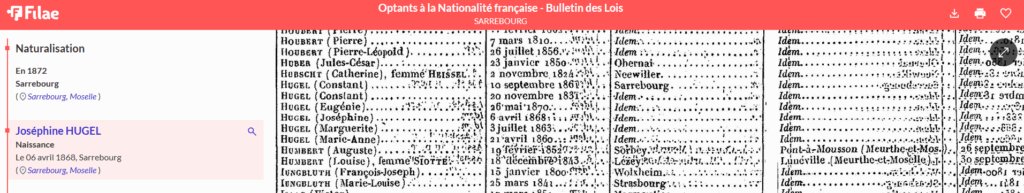 Il apparait dans le bulletin des lois avec ses enfants, notamment Joséphine née le 6 avril 1868 à Sarrebourg et Eugénie née le 26 mai 1870 à Sarrebourg !