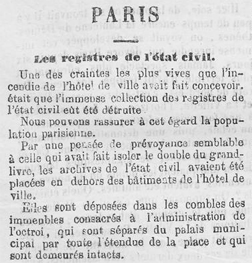 « Une des craintes les plus vives est que l’incendie de l’hôtel de ville avait fait concevoir, était que l’immense collection des registres de l'état civil eût été détruite.