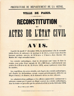 Le 13 août 1871, les petites affiches de la revue judiciaire des cours et tribunaux annoncent que deux lois relatives aux actes de l'état civil détruits ont été votées les 11 et 22 juillet 1871.