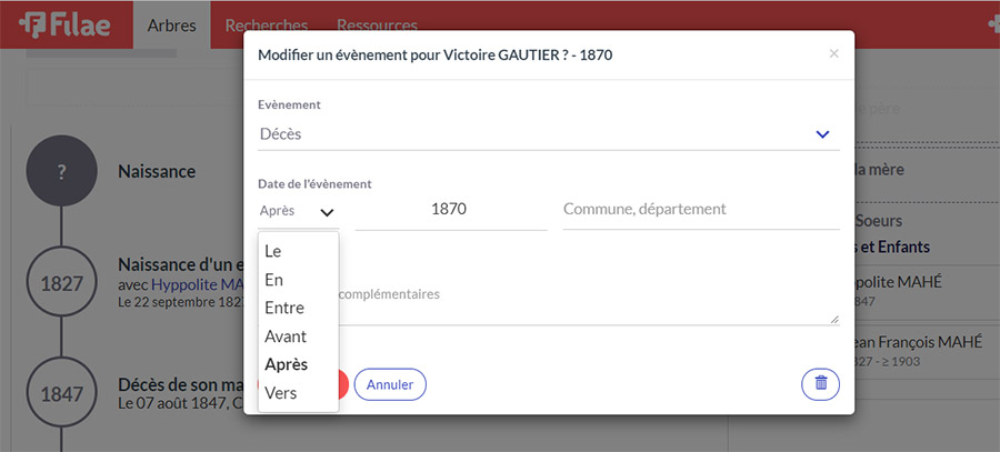 A vous maintenant de réunir des indices et de mener l'enquête ! Naissances, mariages, décès, recensements vous attendent sur Filae.