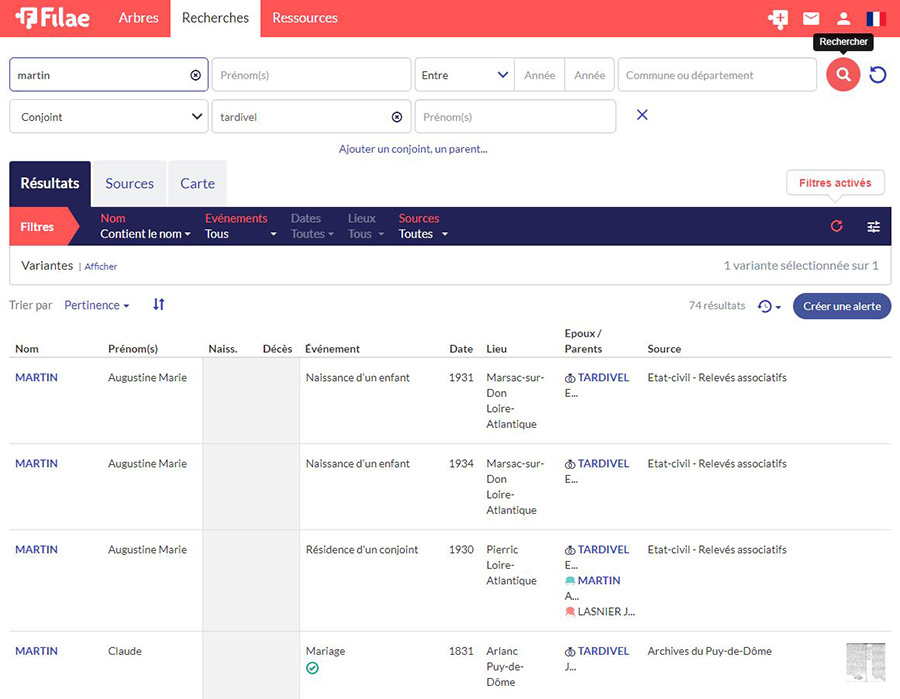 Je n'ai maintenant plus que 10 résultats dans ma recherche ce qui va me permettre de trouver plus facilement l'acte qui m'intéresse au lieu d'en avoir 74.