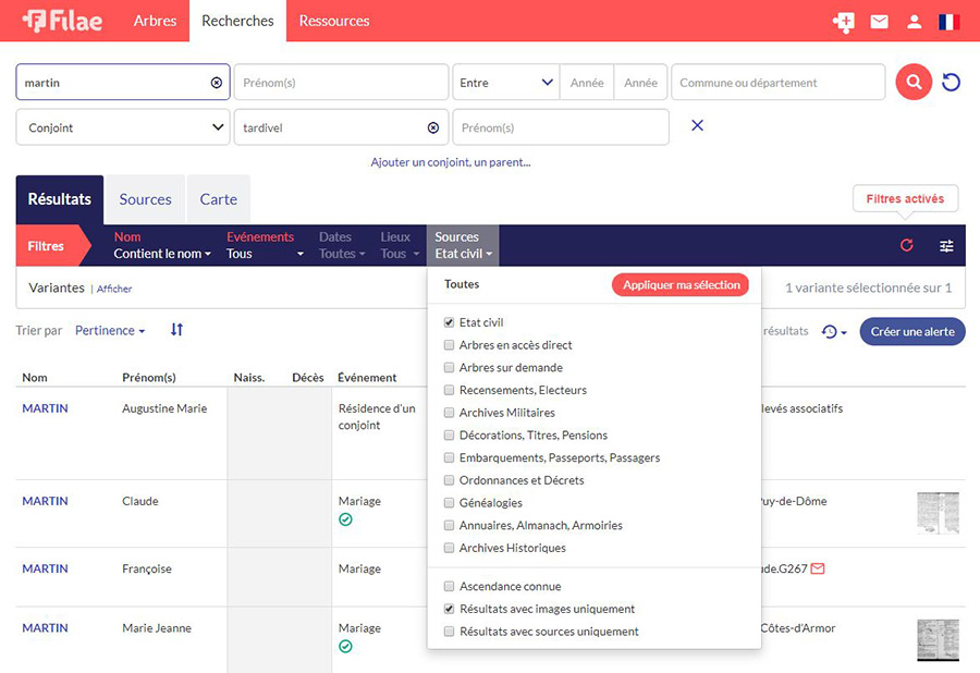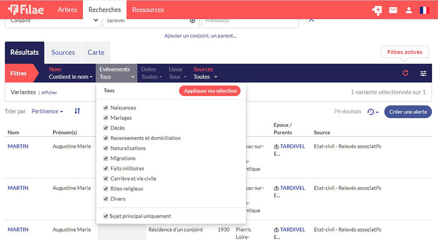 Au lieu de chercher dans cette liste uniquement les mariages, on va utiliser le filtre Evénements et on va prendre "sujet principal uniquement". Vous allez ainsi éviter tous les résultats où les personnes sont citées.