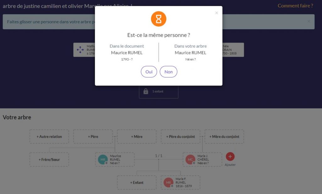 4) Un nouvel écran apparaît vous demandant de choisir les fiches à importer et à fusionner. Filae vous demande d’abord de confirmer si la personne que vous voulez importer et la fiche que vous avez indiqué sont bien les mêmes.