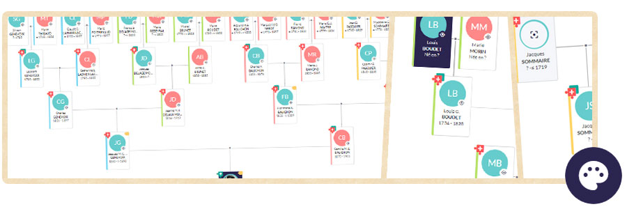 Maintenant, une icône palette permet de coloriser et masquer les couleurs des branches d’un clic. Une couleur apparaît alors à gauche de chaque case en fonction de la branche des ancêtres. En un mot, vous voyez d’un clin d’œil par quel quartier vous descendez de l’ancêtre. Vous repérez aussi plus vite vos ancêtres grâce à la couleur !