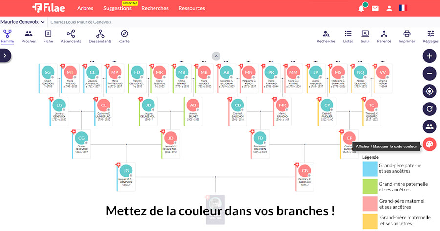 Une nouvelle fonctionnalité apparaît dans les arbres généalogiques : la colorisation des branches pour mieux repérer les quartiers !