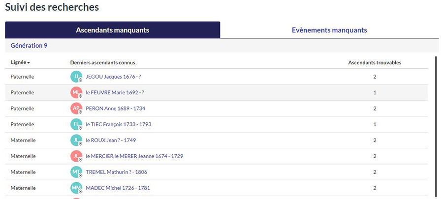 Découvrez en un clic les ancêtres et les événements manquants grâce à la page de suivi de recherche, une fonction pour votre arbre généalogique. Profitez-en c'est gratuit !