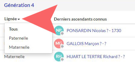 - La lignée paternelle ou maternelle est indiquée. Cliquez simplement sur lignée pour limiter l'affichage à la branche de votre choix.