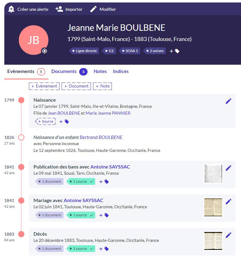 Née Boulbenne à St Malo, elle a fils, se marie avec Antoine Sayssac avec le nom Bourbet et elle décède sous le nom Boulbonne ! Moralité : Mettez des étoiles dans vos recherches !