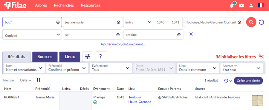 Utilisons encore une fois les jokers ! Mettez des étoiles dans vos recherches ! Nous trouvons bien l’acte au nom de Jeanne Marie Bourbet !