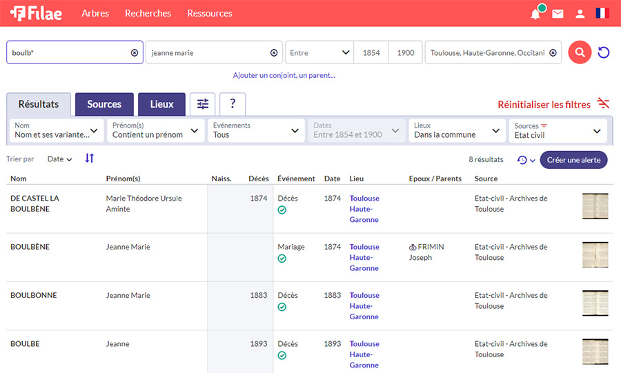Utilisons les jokers Nous cherchons donc Jeanne boulb* entre 1854 et 1900 à Toulouse. Elle est inscrite au nom de Boulbonne !