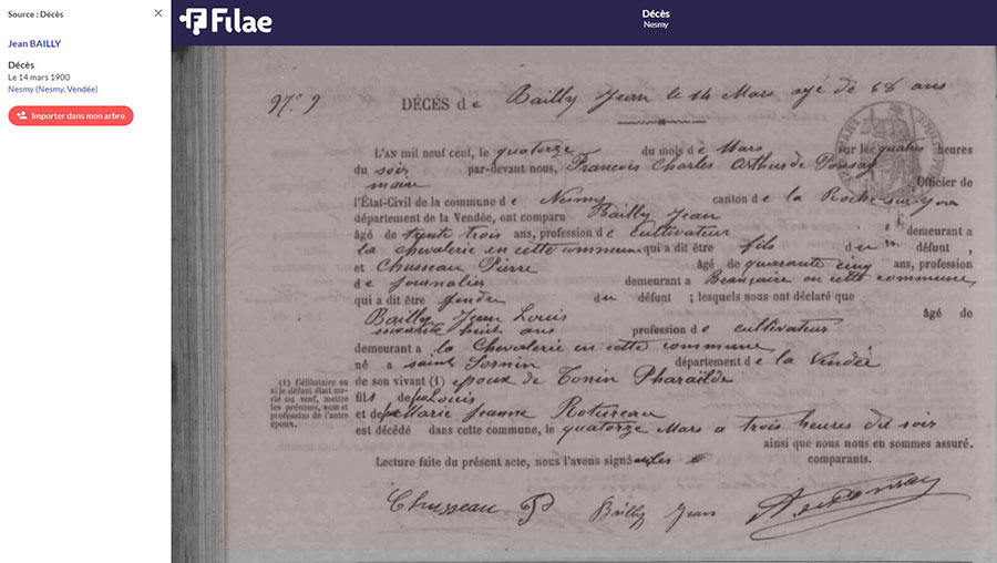 Recherchons alors le décès de Jean Bailly entre 1887 et 1906 à Nesmy. Un seul décès en 1900. Surprise l’acte du 14 mars 1900 indique que de Jean Louis Bailly est époux de Tonin Pharaïlde.