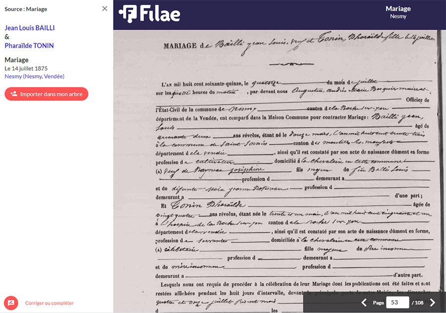 L’astuce est de chercher et de vérifier les actes de sa famille : conjoint et enfants. Des informations intéressantes peuvent se trouver dans les actes ce qui a été le cas ici. On aurait pu aussi chercher les mariages de Jean Bailly sans mettre de conjoint en filtrant sur l’événement mariage d’abord dans la commune et aux alentours !