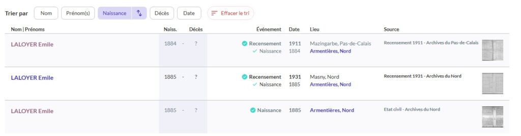 En conservant les critères de recherche précédent, il suffit de modifier le filtre par année de naissance. Ce tri permet de repérer des recensements ou même des décès des années plus tard.