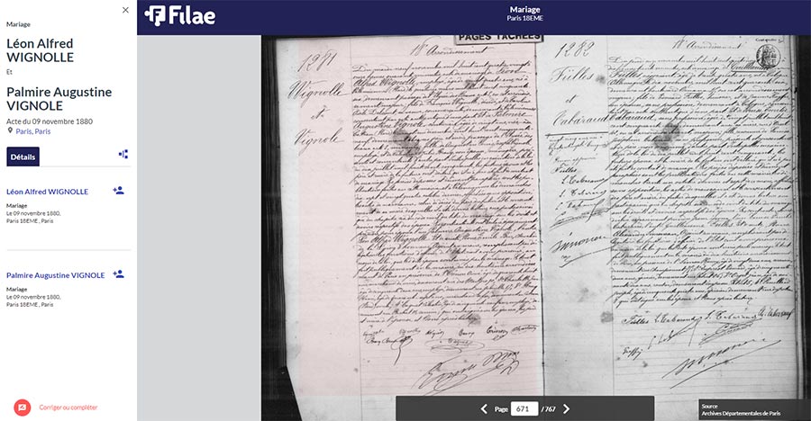 Il faudra utiliser le joker * pour trouver leur mariage. En effet, les parents d’Yvonne se sont mariés à Paris dans le 18e arrondissement le 9 novembre 1880 mais l’orthographe n’est pas la même pour les deux époux :