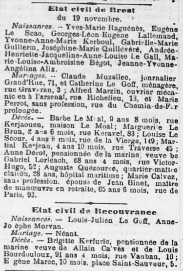 Le 22 novembre 1903, le journal, L’Ouest-Eclair, publie les naissances, mariages et décès du 19 novembre. Pour les mariages , les professions et les adresses sont indiquées. Même chose pour les décès avec l’âge du défunt.