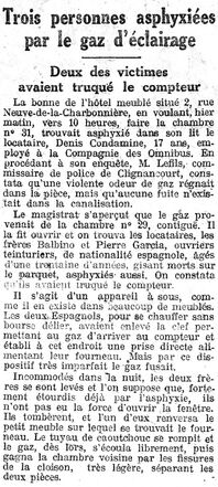 Plusieurs articles, dont Le Petit Journal du 8 janvier 1918, relate les circonstances de la mort de Denis Condamine, 17 ans, employé à la Compagnie des Omnibus, asphyxié par le gaz d’éclairage. ..