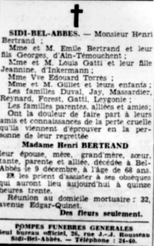 Faire-part de décès de Madame Henri Bertrand publié dans l’Echo d’Oran le 10 décembre 1938