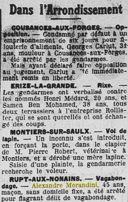 Le bulletin meusien du 23 mai 1931 publie diverses informations sur des filouteries, des rixes, des vols et des vagabondages.