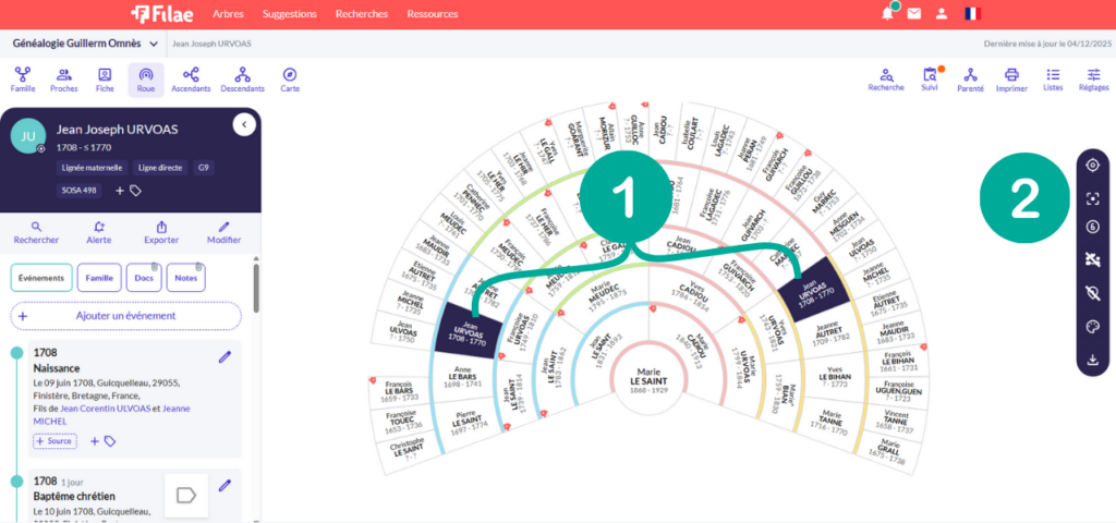 Une nouvelle icône « Centrer sur l’individu » a été ajoutée (2). Elle vous permet de replacer instantanément la personne sélectionnée au cœur de la roue.