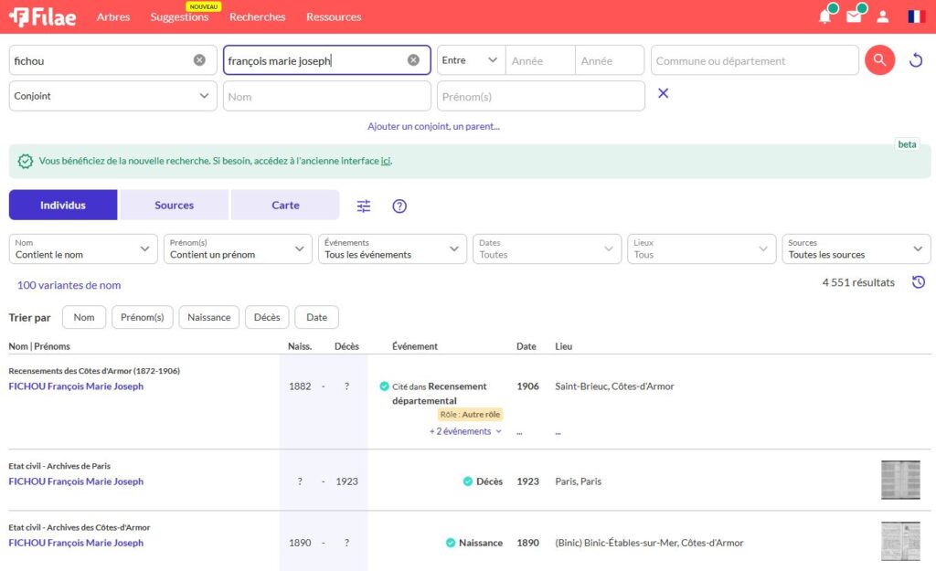 Les départements et villes dont l’état civil est enrichi des parents et conjoints sont présentés dans la FAQ.