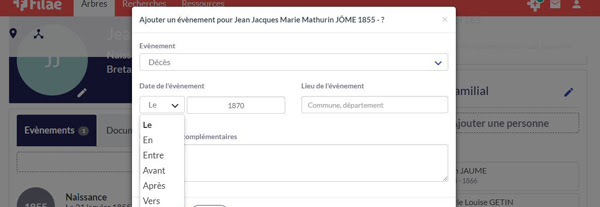 Ajoutez simplement un décès et indiquez avant ou après l’année de l’événement. Pour la résidence, saisissez la date et le lieu… Vous recherchez ensuite des éventuels événements dans la commune…