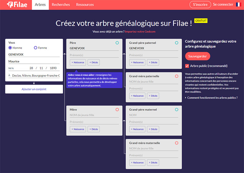 Si vous n’êtes pas connecté à un compte, Filae vous propose de vous connecter ou de créer maintenant votre compte gratuit afin de conserver votre arbre.
