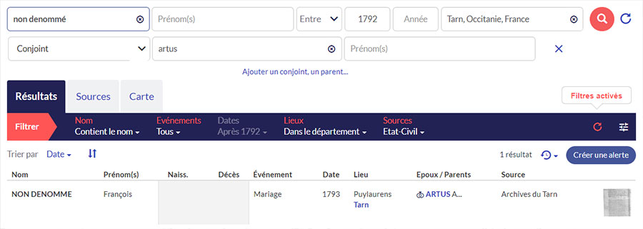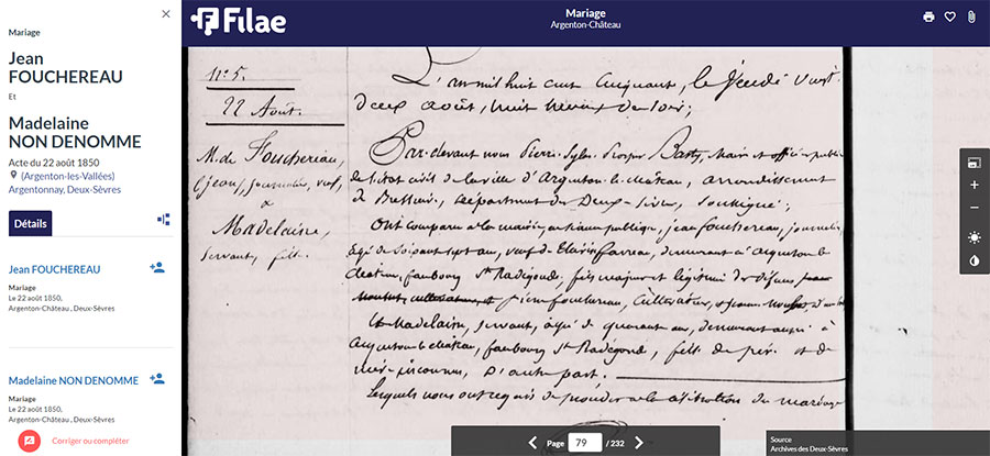 Si l’acte ne contient pas de nom, il a été choisi de saisir non dénommé. N’hésitez donc pas à saisir ce terme pour le nom de famille si vous ne trouvez rien ! Jean Fouchereau se marie ainsi avec Madelaine née de parents inconnus. Si vous recherchez un couple, vous trouverez un article avec des conseils pour retrouver un mariage.