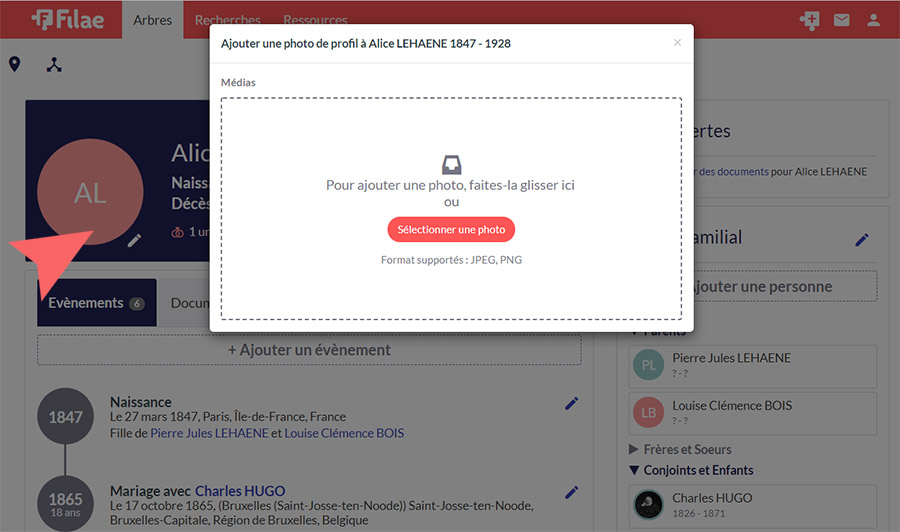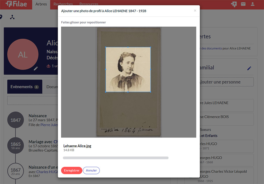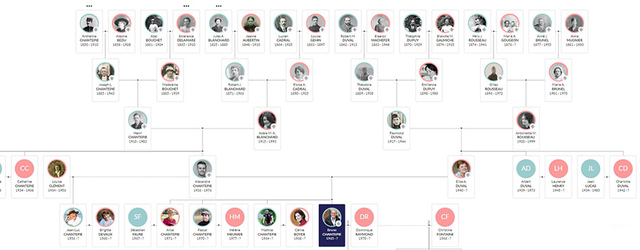 Vous ajoutez une photo aux personnes de votre choix : ancêtres et proches. Bien sûr les photos des personnes confidentielles ne seront pas visibles.