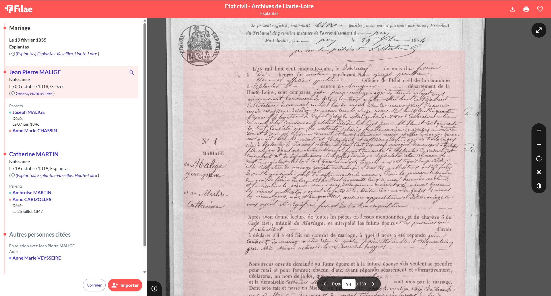 Des ancêtres en Haute-Loire ? L’état civil a été réindexé en saisissant parents, conjoints, âges, naissances… Vous obtenez maintenant des résultats plus riches et plus précis permettant ainsi de reconstituer les familles plus facilement !