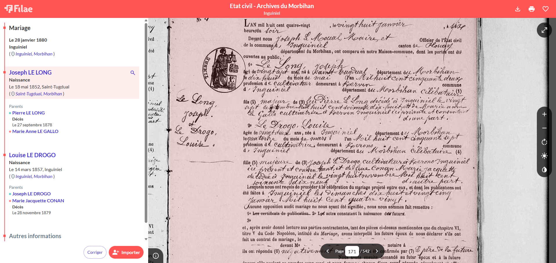 Cap à l’Ouest, dans le Morbihan ! L’état civil a été patiemment relu afin de saisir des détails comme les parents, conjoints, âges… Vous allez maintenant obtenir des résultats plus précis et plus riches !