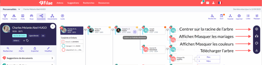 Une nouvelle icône Télécharger fait son apparition ! Exportez votre arbre en image pour l’imprimer, l’intégrer dans un document, ou le partager par e-mail et sur les réseaux sociaux.