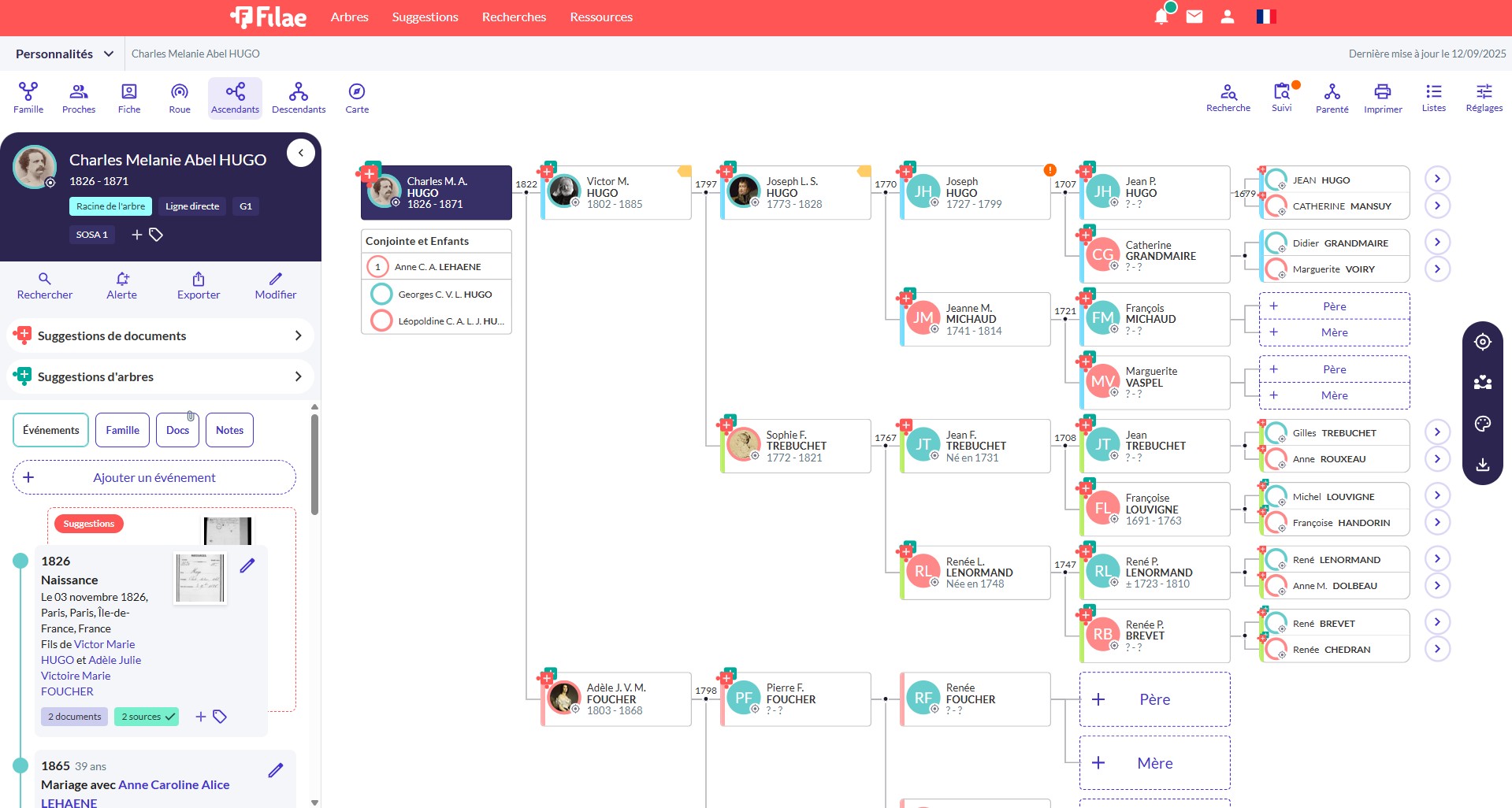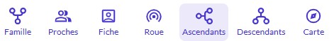 La vue Ascendants permet d’afficher l’ascendance d’une personne sur 6 générations. Cette vue est interactive et permet de naviguer de fiche en fiche tout en saisissant des informations et des individus.