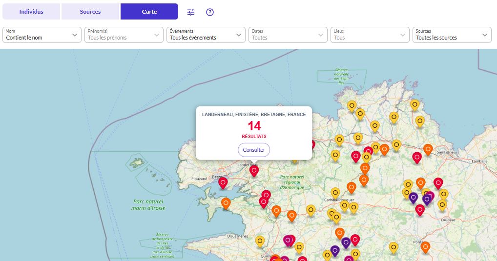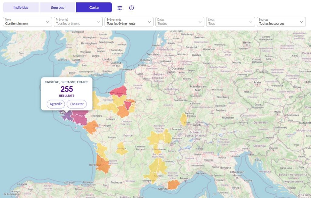 Cliquez simplement sur une commune ou un département, puis sur « Consulter » pour obtenir la liste des individus ayant un événement dans ce lieu.