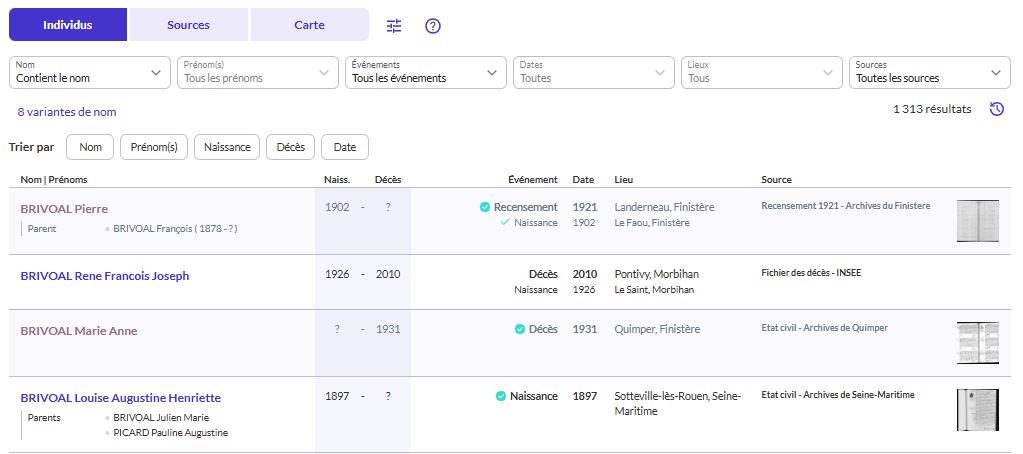 Filae propose également un affichage par sources, accessible en cliquant simplement sur l’onglet « Sources » à gauche de « Individus ».
