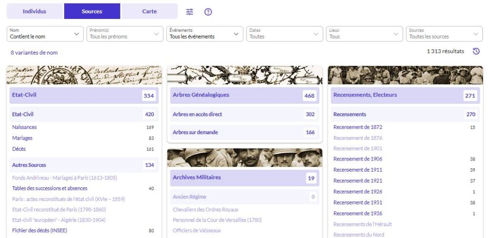 Par exemple, si vous recherchez une personne et obtenez des centaines de résultats, l’affichage par sources peut révéler des informations précieuses, comme des mentions dans les « Pensions civiles » ou les « Titres et homologations et services pour faits de résistance ».