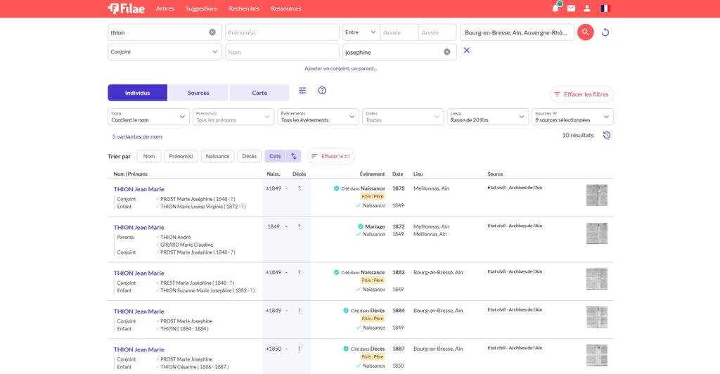 💡 L’astuce Filae, Trouver un mariage : Pour débloquer la situation, recherchez le mariage en saisissant d’abord le nom de chaque conjoint dans le moteur de recherche. Si vous ne trouvez rien, vérifiez l’orthographe ou les variantes des noms. S’il y a trop de résultats, affinez votre recherche en mettant des prénoms.