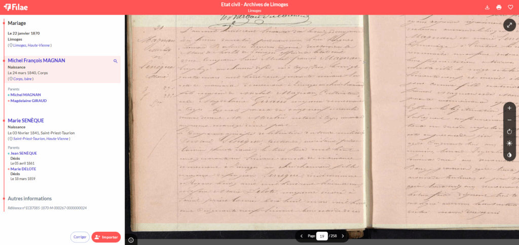 💡 L’atout Filae, L’acte original. Privilégiez toujours la lecture de l’acte original numérisé, accessible directement sur Filae. Les arbres en ligne (même le vôtre !) peuvent contenir des erreurs de recopie ou de recherche. Rien ne vaut la source primaire.