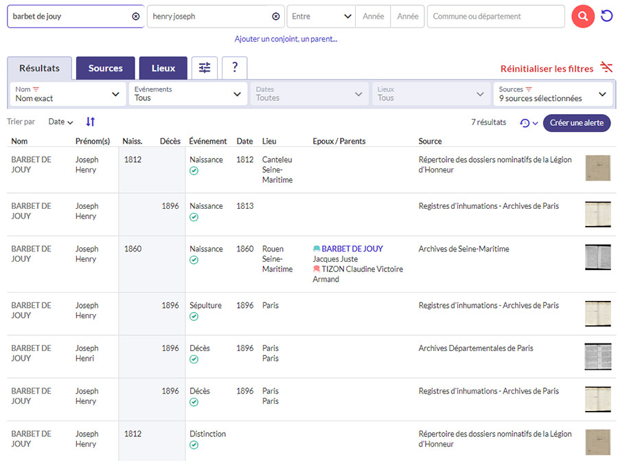 Dans un premier temps nous lançons une recherche avec simplement son nom et prénom. Dans les filtres nous avons sélectionné « Nom exact » et toutes les sources sauf les arbres.