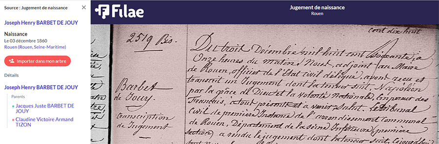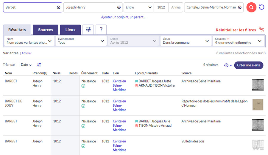 Sa naissance n’apparaît pas mais comme il y a eu un changement de nom, il doit être né Barbet. Nous lançons donc une nouvelle recherche, à Canteleu, avec le nom Barbet sans Jouy. Nous choisissons aussi le filtre "nom et ses variantes phonétiques".