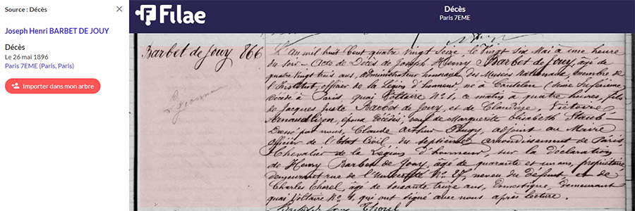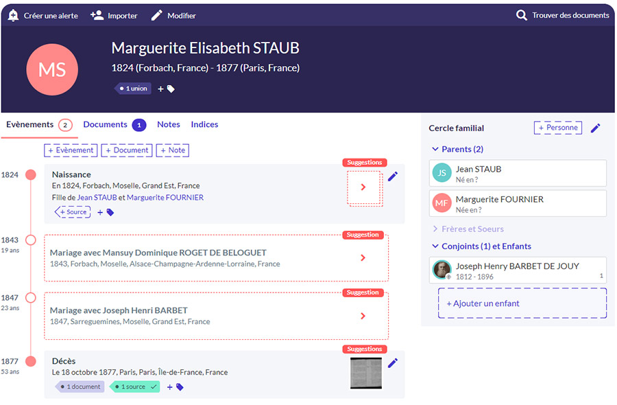 Après avoir cherché et ajouté le décès de Marguerite Elisabeth Staub dans l’arbre de la famille Barbet de Jouy, nous avons ajouté ses parents, cités dans l’acte de décès, son lieu de naissance et l’année selon l’âge indiqué.