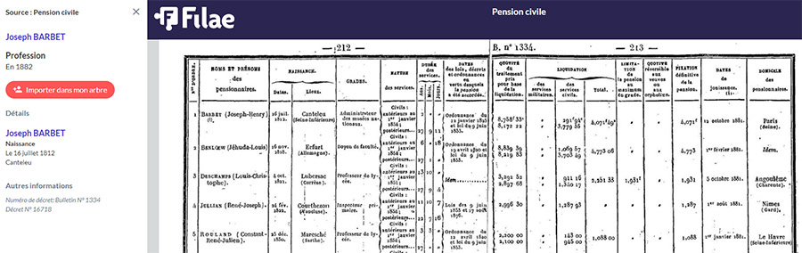 - Et surprise , un nouveau document, une page du Bulletin des lois datée de 1882. C’est un décret qui nous apprend qu’il obtient une pension de retraite pour ses années de services.