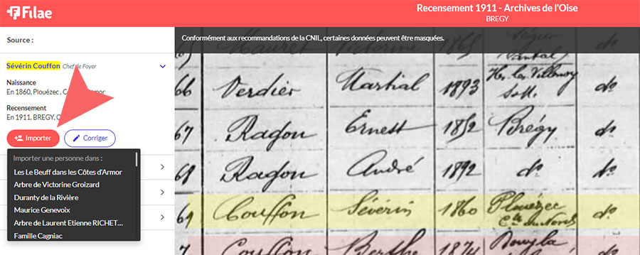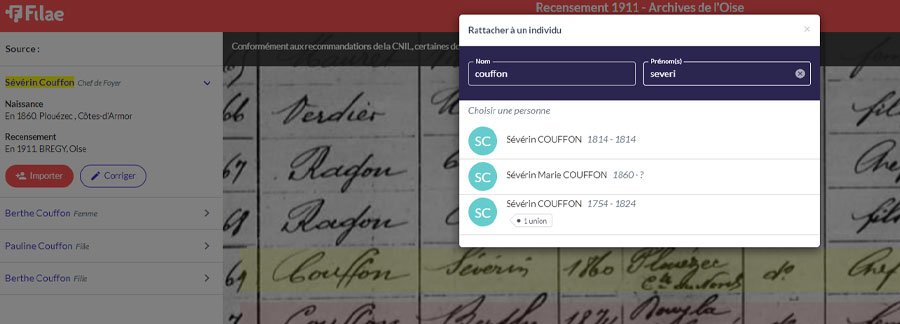Cette étape est essentielle. Sachez que si vous n’êtes pas sûr de l’orthographe saisie pour la personne, il est possible de taper une partie seulement du nom et du prénom. Filae vous propose la liste des personnes présentes dans votre arbre. Attention aux homonymes !