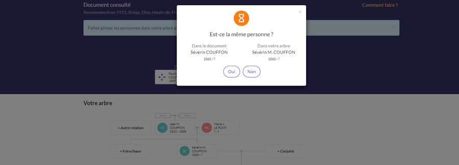 Cliquez sur l’individu : Filae vous demande s’il s’agit de la même personne, celle du document et celle de l’arbre. Cliquez sur oui ou non.
