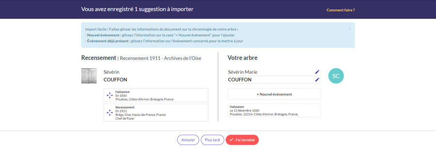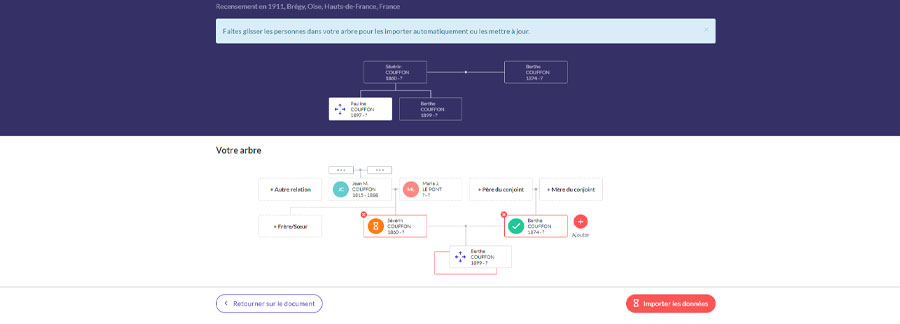 Vous devrez en fonction de la réponse précédente et du nombre d’individus du document, glisser les personnes soit vers un individu existant dans votre arbre pour ajouter des données soit vers les cases vides qui permettent d’ajouter des individus afin de les créer dans votre arbre.